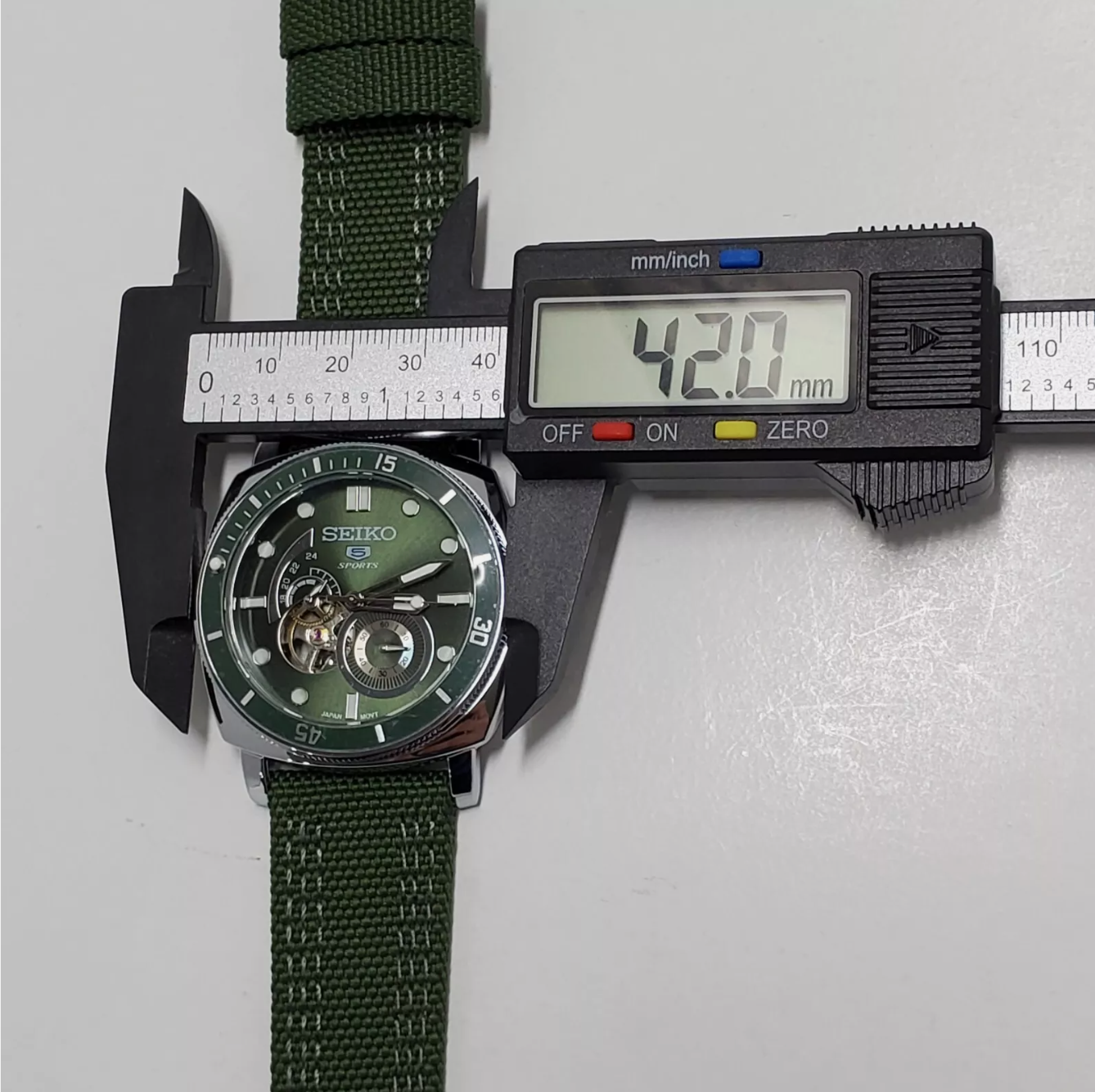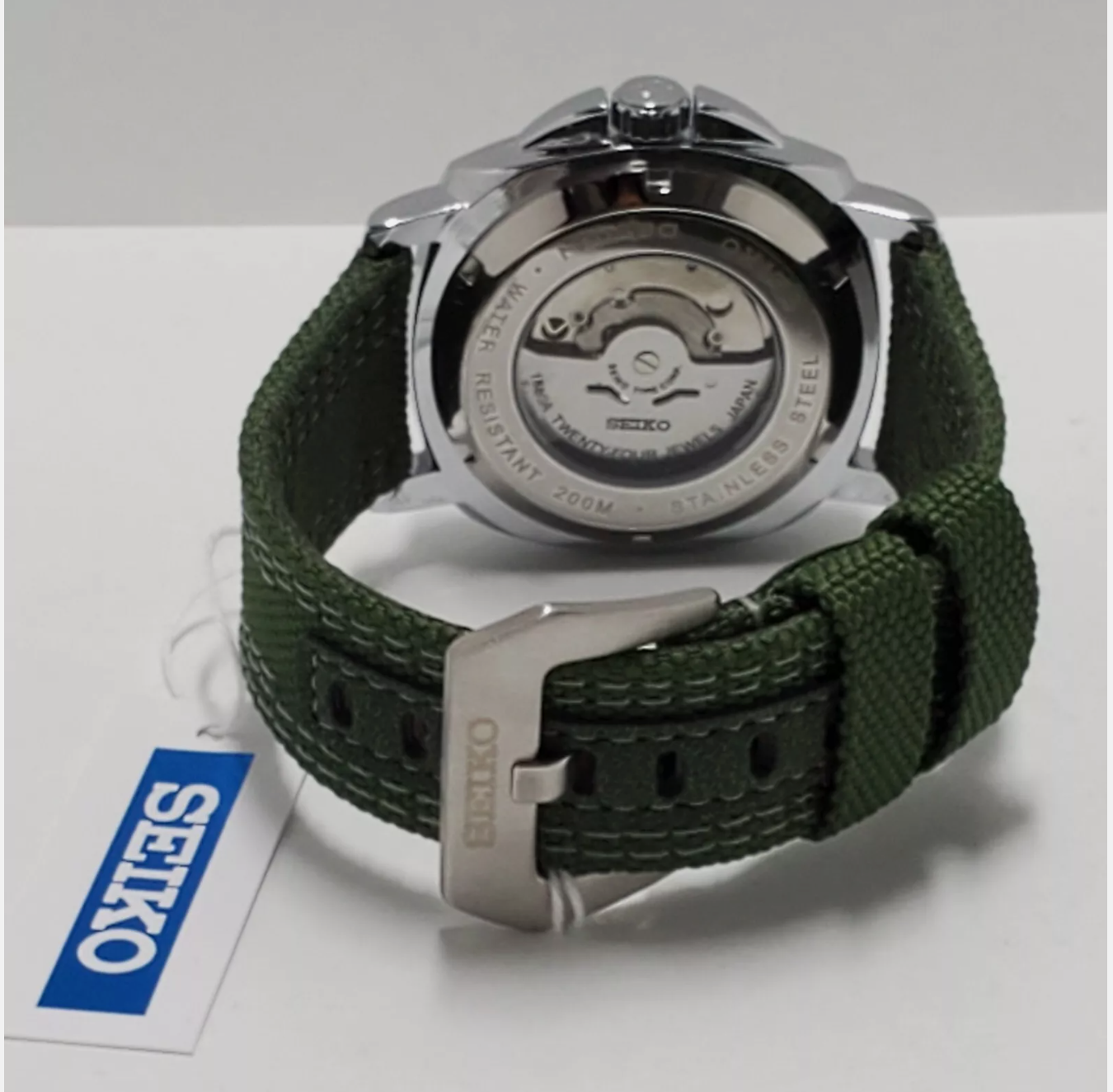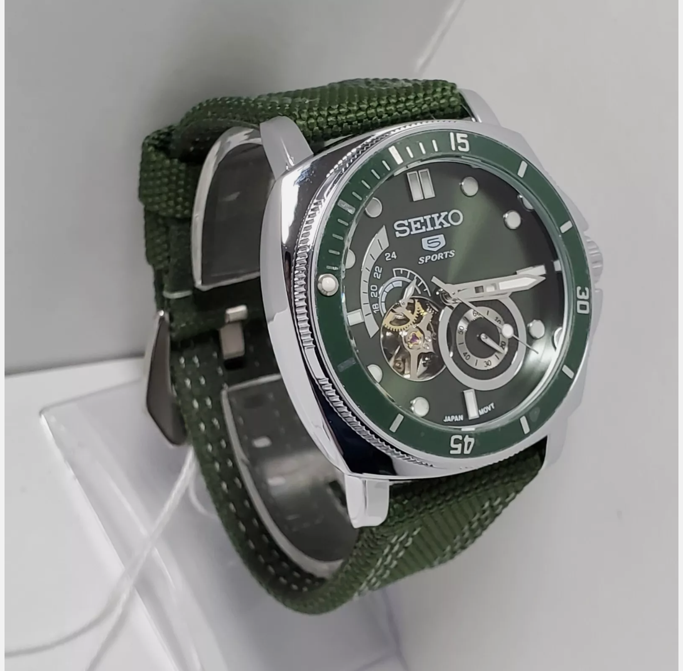 Seiko 1880A Movimiento automático. 42 mm. Brazalete de cuero y caucho entelado. Color verde musgo. Maquina a la vista. Excelente estado.